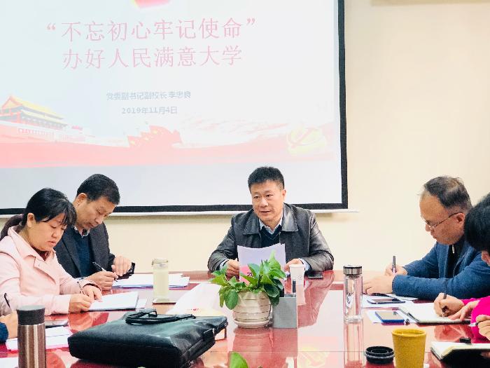 11月4日,校党委副书记副校长李忠良到马克思主义学院,为学院全体行政干部、教研室主任及教师代表讲授党课。 李忠良围绕“不忘初心,牢记使命,办人民满意的大学”主题,从三个方面进行了讲授。一是深刻领会习近平总书...